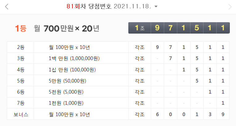 81회차 연금복권 당첨 번호 결과 (2021년 11월 18일 - 월 700만원 X 20년)