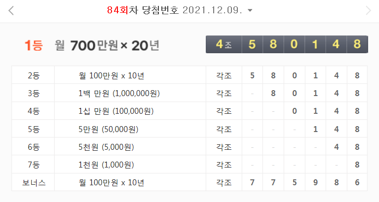 84회차 연금복권 당첨 번호 결과 (2021년 12월 9일 - 월 700만원 X 20년)