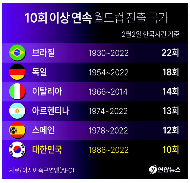 10회 이상 연속 월드컵 진출 국가 (대한민국은 6번째 국가로 등극)