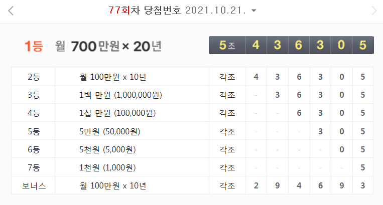 77회차 연금복권 당첨 번호 결과 (2021년 10월 21일 - 월 700만원 X 20년)